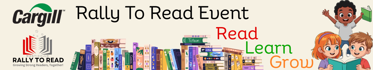 Join us for the Rally to Read Event, a fun and engaging community celebration during “I Love to Read Month!” Hosted in partnership with Cargill and Monticello Rally to Read, this free event is designed to inspire a love of reading while bringing families together.